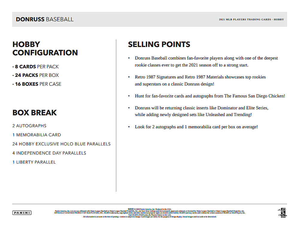 2021 Donruss Baseball features the brand’s usual mix of variety. It’s a bit of a throwback but there are plenty of modern elements. Collectors will find their autographs and memorabilia cards in every hobby box but they’re also land lots of base cards and inserts. Familiar inserts that go way back collide with new ones. You get the idea.