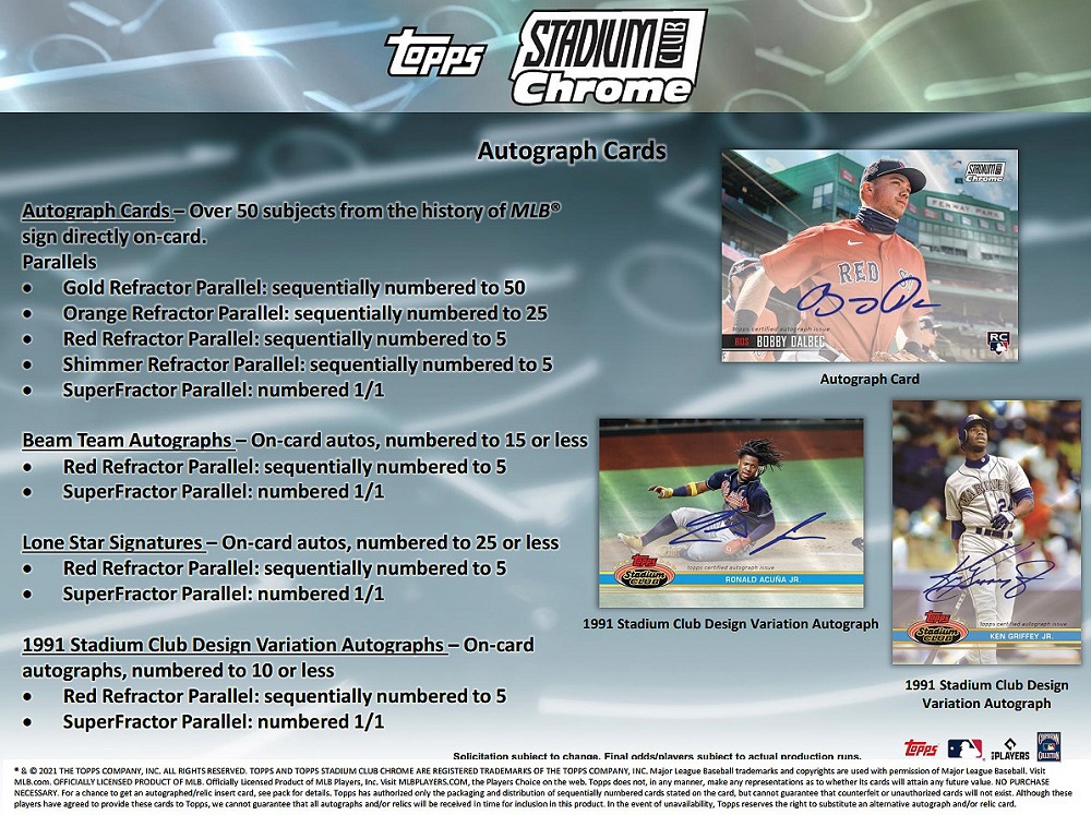 There’s also 1991 Stadium Club Design Variation Autographs (/10 or less) and Beam Team Autographs (/15 or less) that have their own Red Refractors (/5) and Superfractors (1/1).