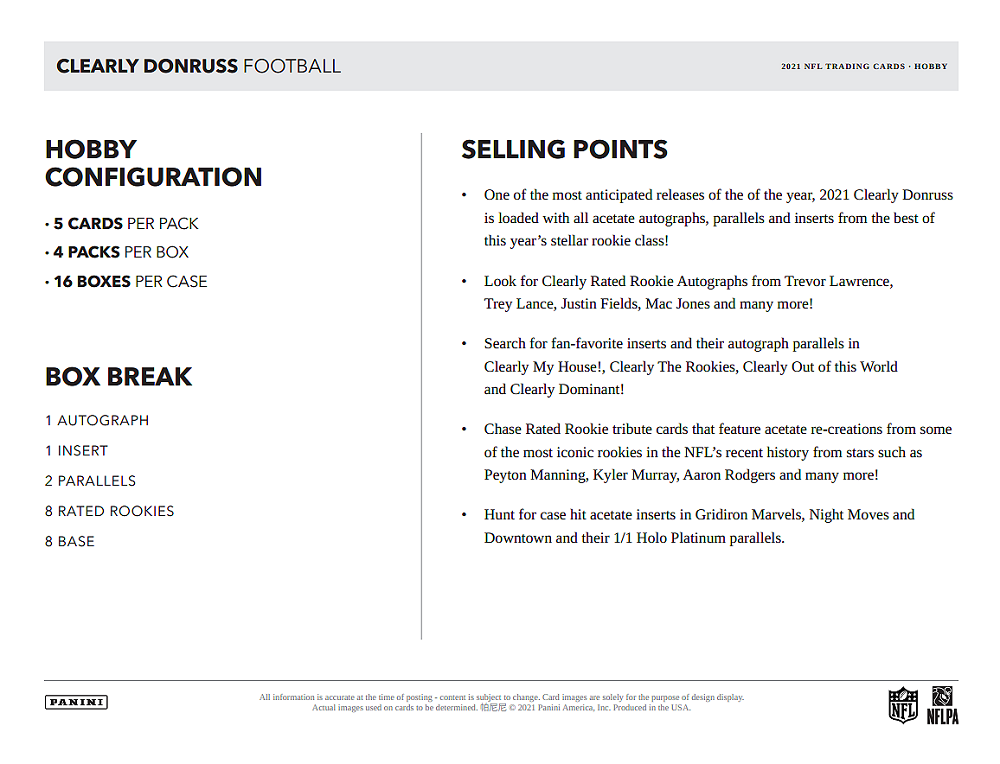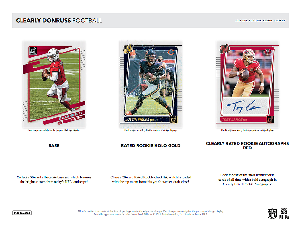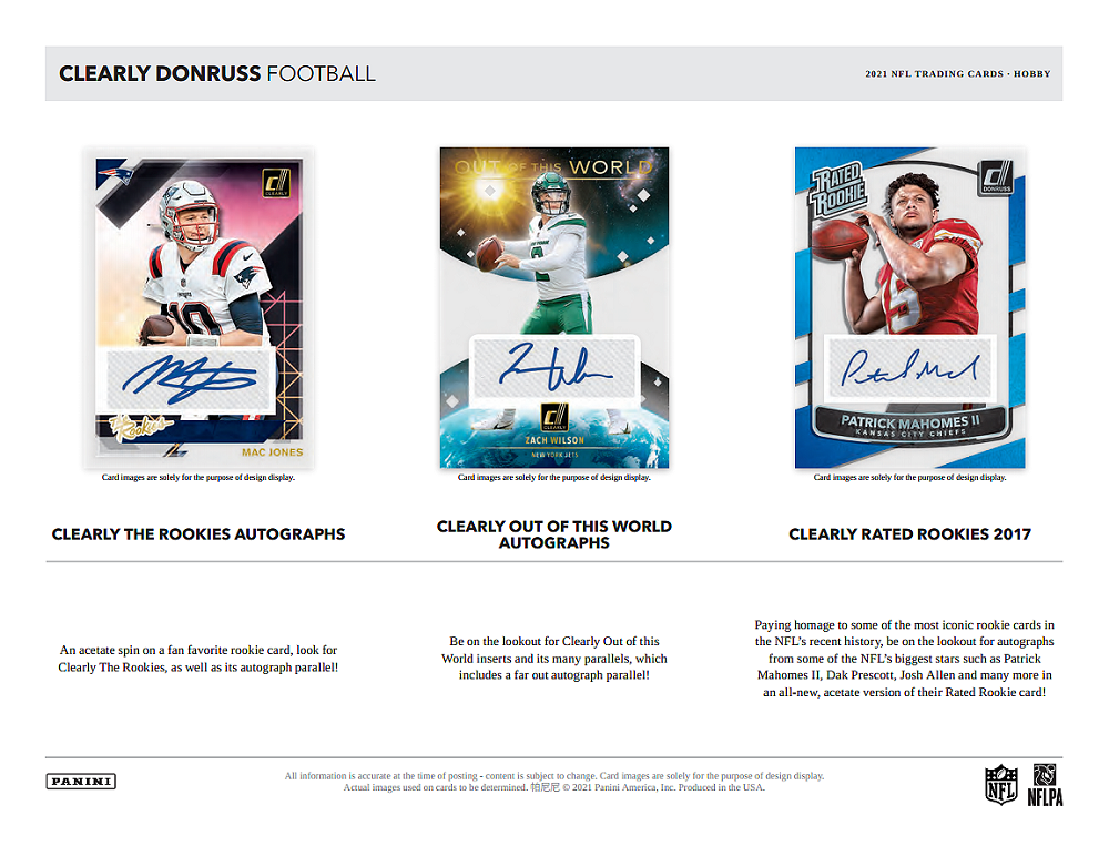 After a couple of releases in basketball and a spot in 2020 Panini Chronicles, 2021 Clearly Donruss Football marks the brand’s standalone debut in the sport. An extension of the main Donruss line, here cards are given an acetate twist. In turn, it’s more premium but not to the point where it’s an extremely high-end release.