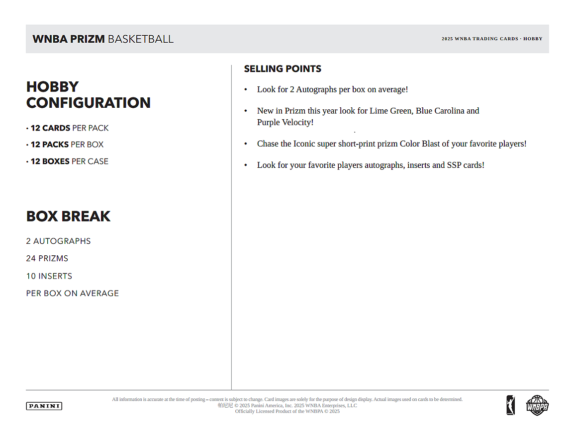 2025 WNBA Panini Prizm 04/02/2026(四)上市。